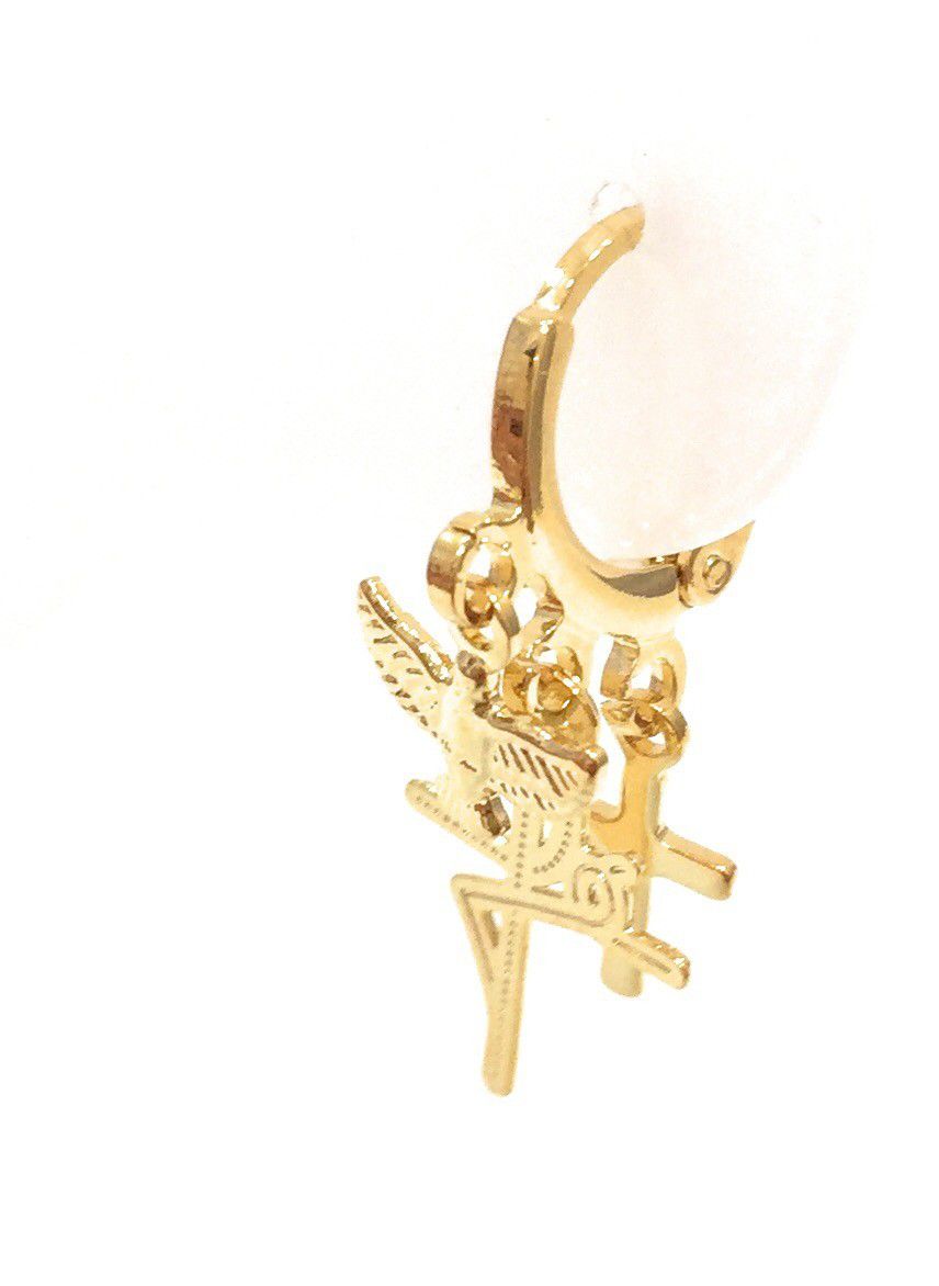 Esta argolinha articulada tem como pingentes os símbolos: Espírito Santo, Fé e Crucifixo. Toda banhada em ouro 18k.