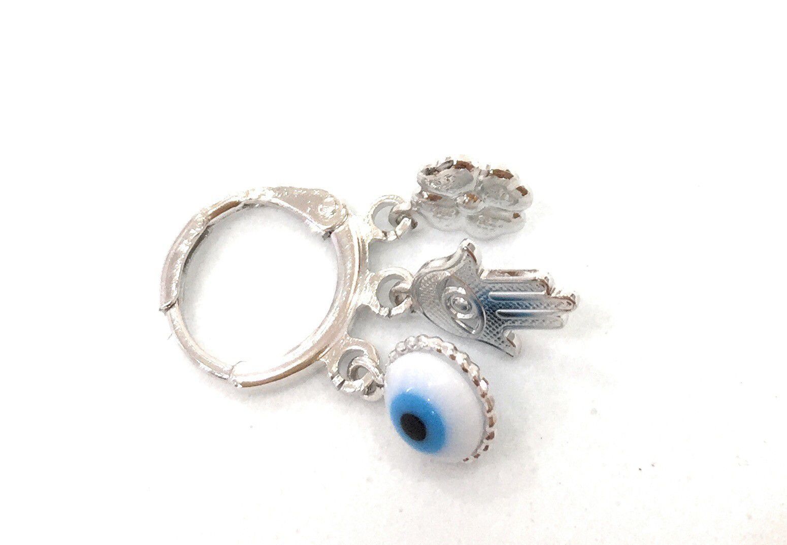 Argolinha articulada em banho de ródio com pingentes de Olho Grego em resina, Mão-de-Fátima e Trevo de Quatro Folhas.