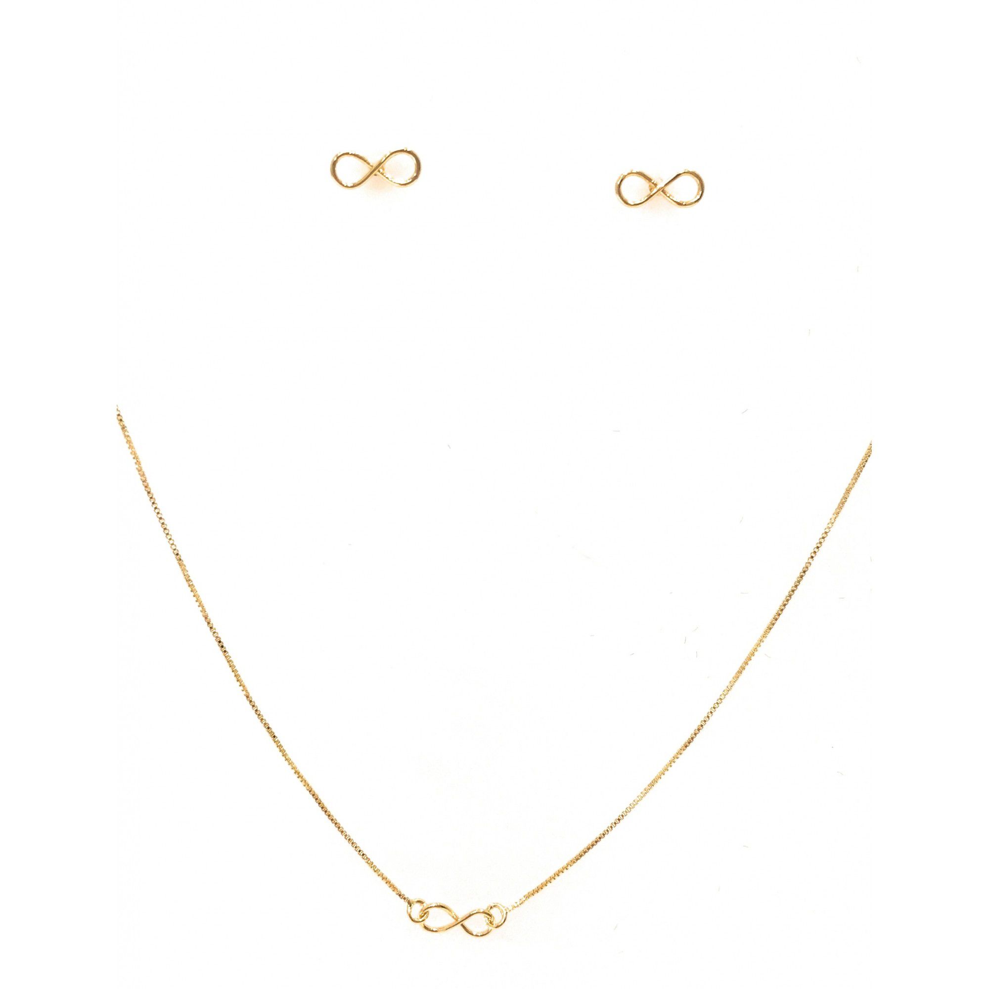 Linda gargantilha com banho em ouro 18k delicadamente composta por correntaria veneziana e pingente vazado formato infinito.