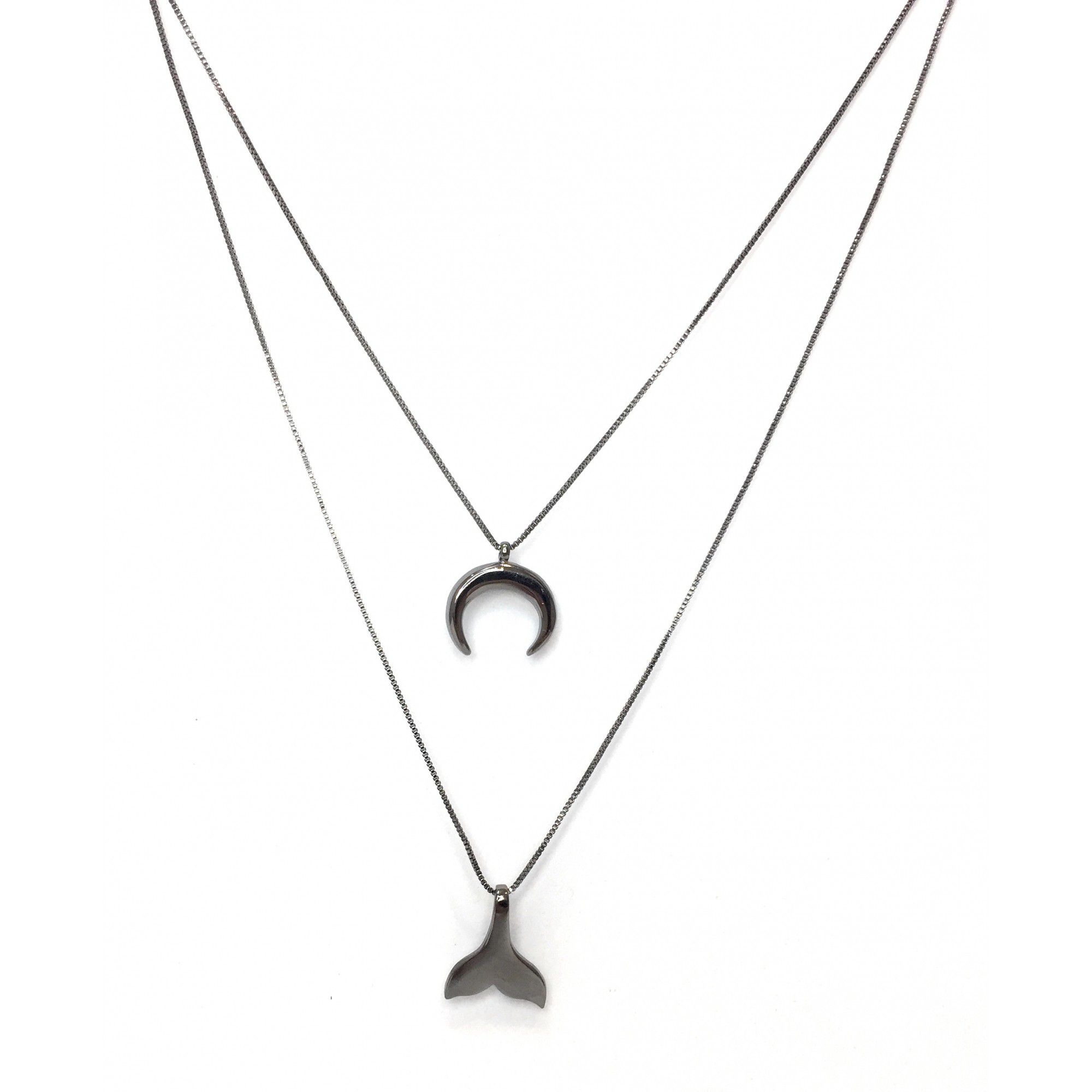 Peça composta por correntaria veneziana banhada em ródio negro com pingentes cauda de baleia (16x22mm) e chifre italiano (18x15mm).