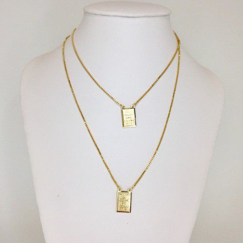 Para quem não abre mão das peças com motivos religiosos, este escapulário é perfeito, todo em corrente veneziana e as plaquinhas (pingentes) com mensagens bíblicas.