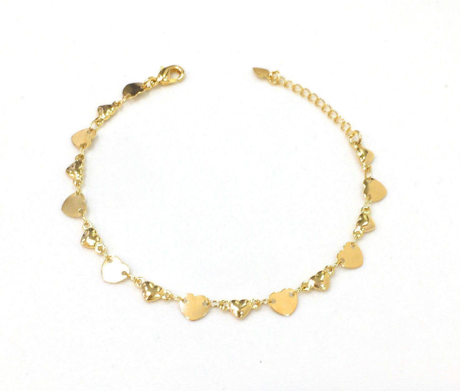 Peça delicada e cheia de charme... Pulseira toda em corações em formato de plaquinhas e outros, abaulados, no banho de ouro 18k.